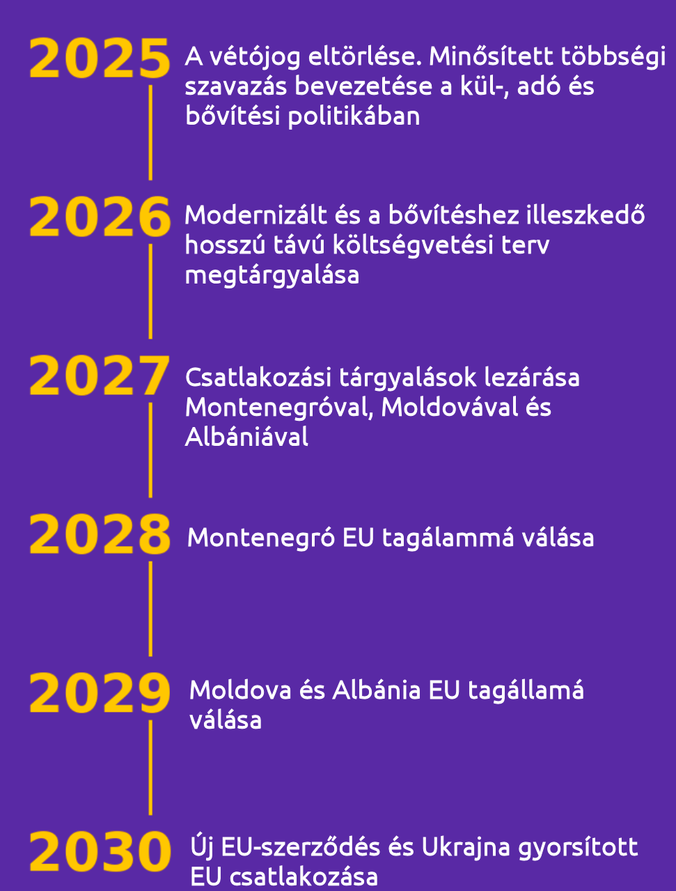 2030-ra mindez biztosítja, hogy egy 500 milliós, 35+ tagú Unió sikeresen működhessen. Fontos, hogy Ukrajna csatlakozása és annak hatásai egybeessenek a szerződésmódosítás feltételeinek megteremtésével – ne pedig feltételként akadályozzák azt. Ukrajna csatlakozását lehetőségként kell látni az EU mélyreható megújítására.